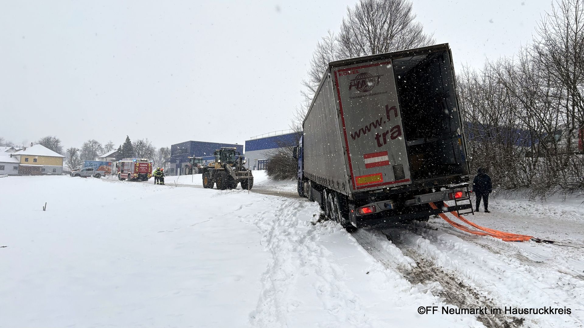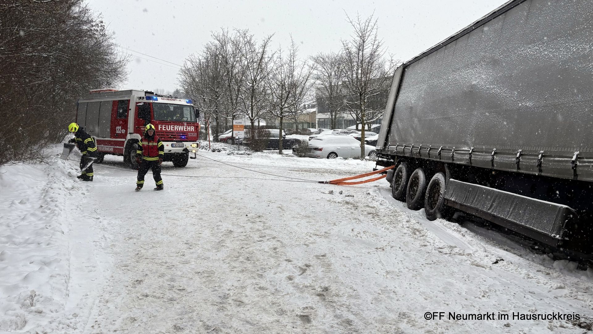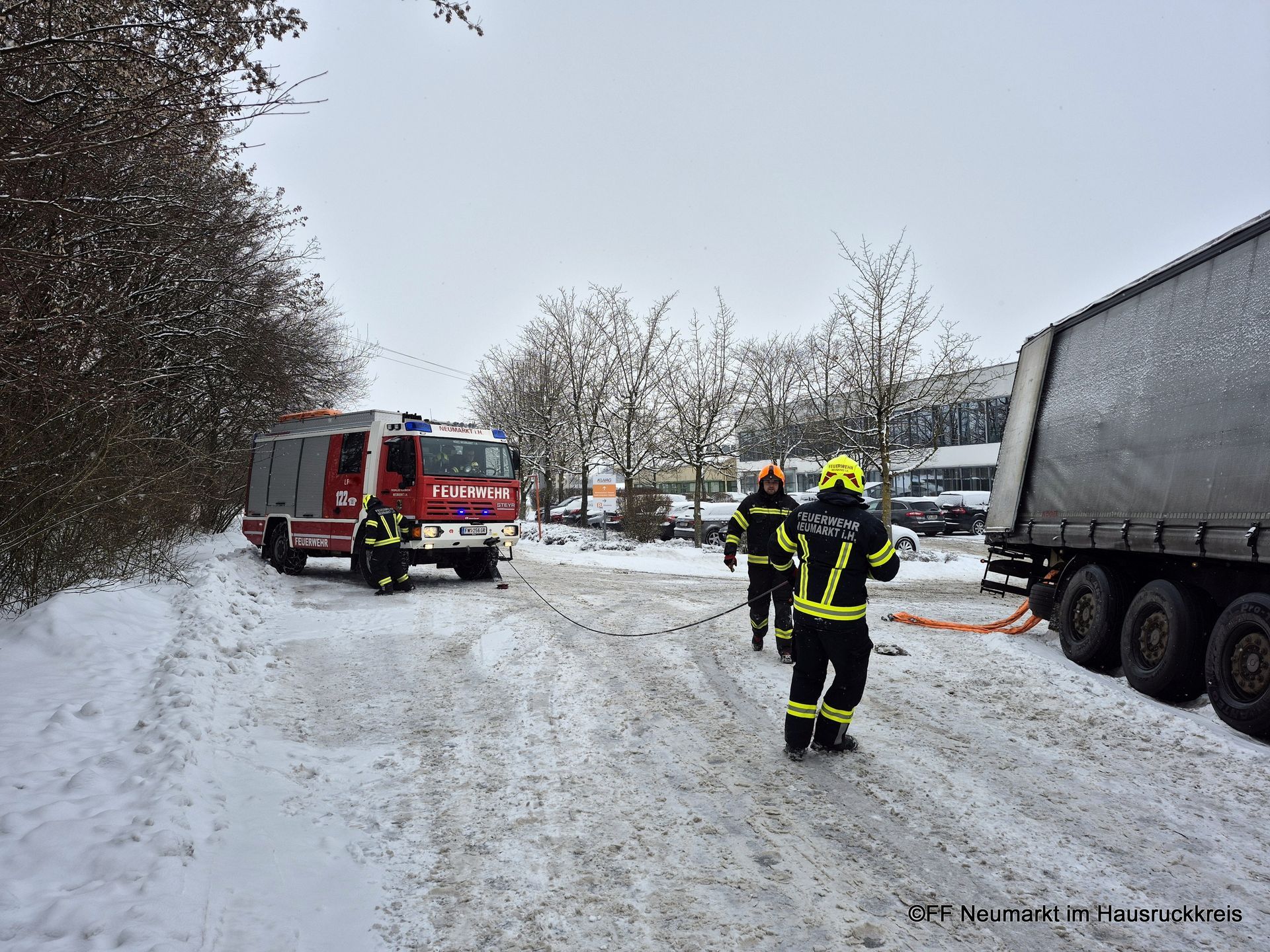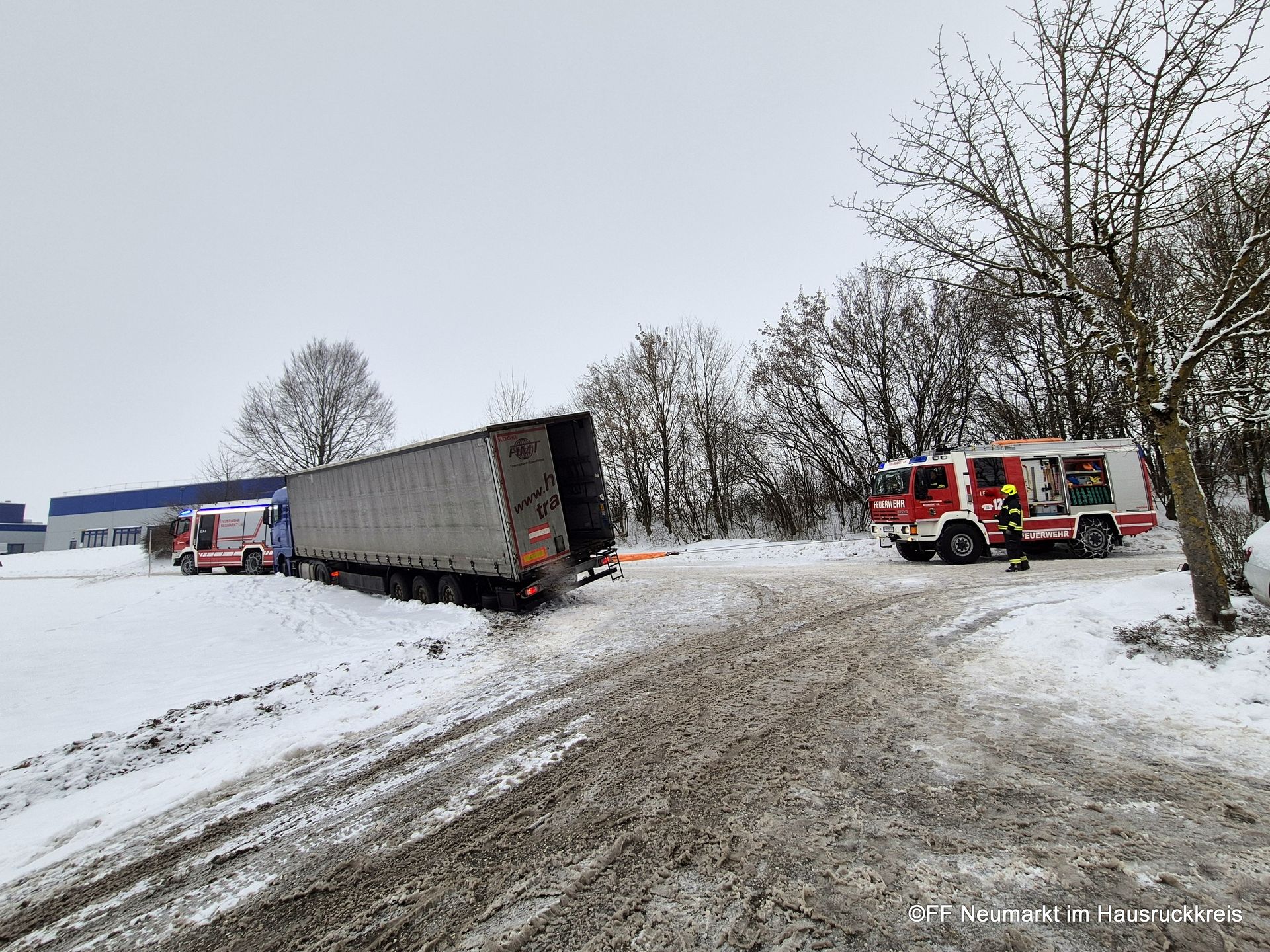 Die Freiwillige Feuerwehr Neumarkt im Hausruckkreis wurde um 13:57 Uhr zu einer Lkw-Bergung alarmiert. Ein mit rund 24 Tonnen beladener Lkw nahm bei der Ausfahrt eines Firmengeländes eine Kurve zu eng und blieb mit dem Sattelauflieger in einer Böschung hängen.