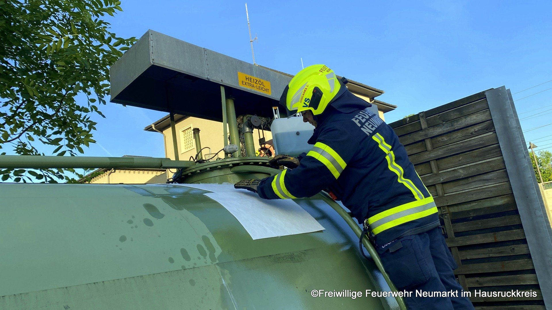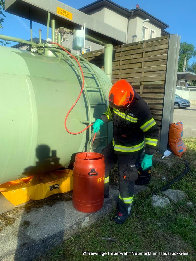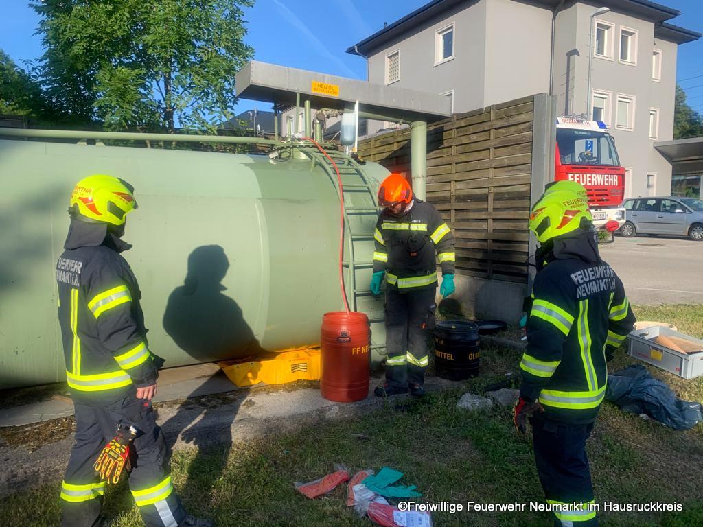 Am Einsatzort wurde festgestellt, dass aufgrund der hohen Außentemperatur eine Armatur am Tank platze und das Heizöl überlief. Die Feuerwehr platzierte eine Auffangwanne und pumpte 200l Heizöl aus dem Tank. Währenddessen wurde vom Notfallkoordinator der ÖBB die Bahnmeisterei Neumarkt im Hausruckkreis verständigt. Danach wurde der gesamte Bereich mit Ölbindemittel gebunden und entsorgt.