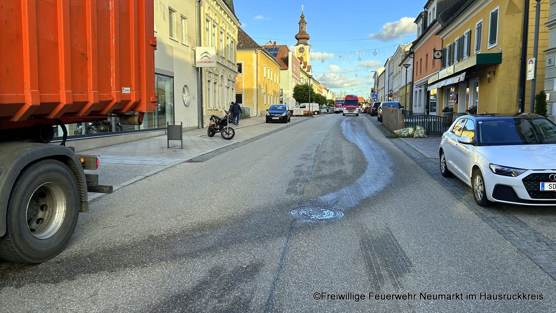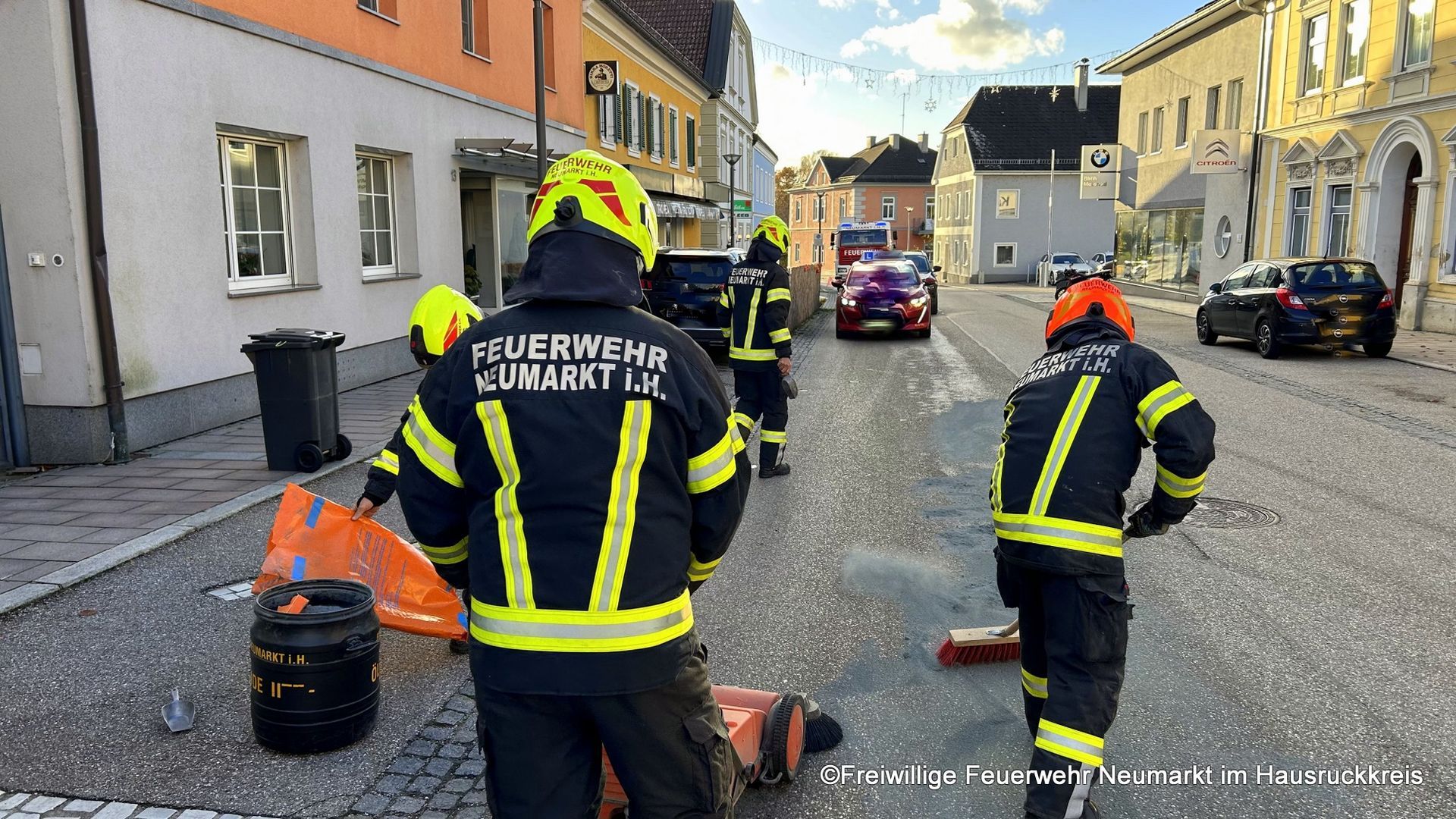 Die Freiwillige Feuerwehr Neumarkt im Hausruckkreis wurde um 14:43 Uhr zu einer Ölspur am Marktplatz alarmiert.