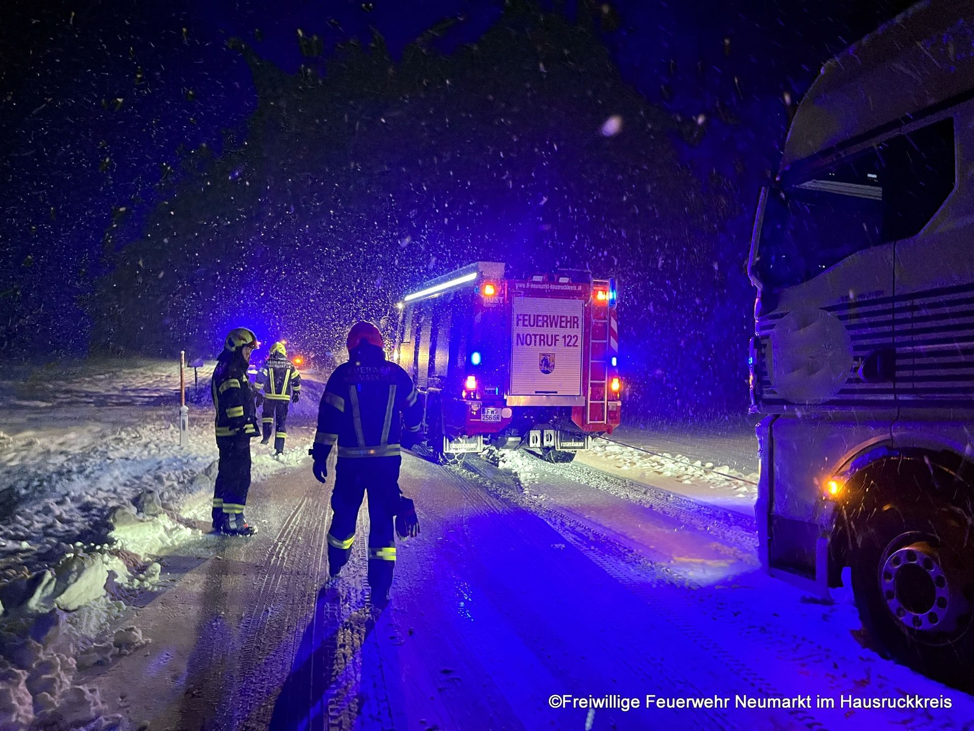 Aufgrund der anhaltenden Schneefälle konnte sich ein Sattelzugfahrzeug nicht mehr aus dem Kreuzungsbereich befreien und musste von der Feuerwehr geborgen werden.