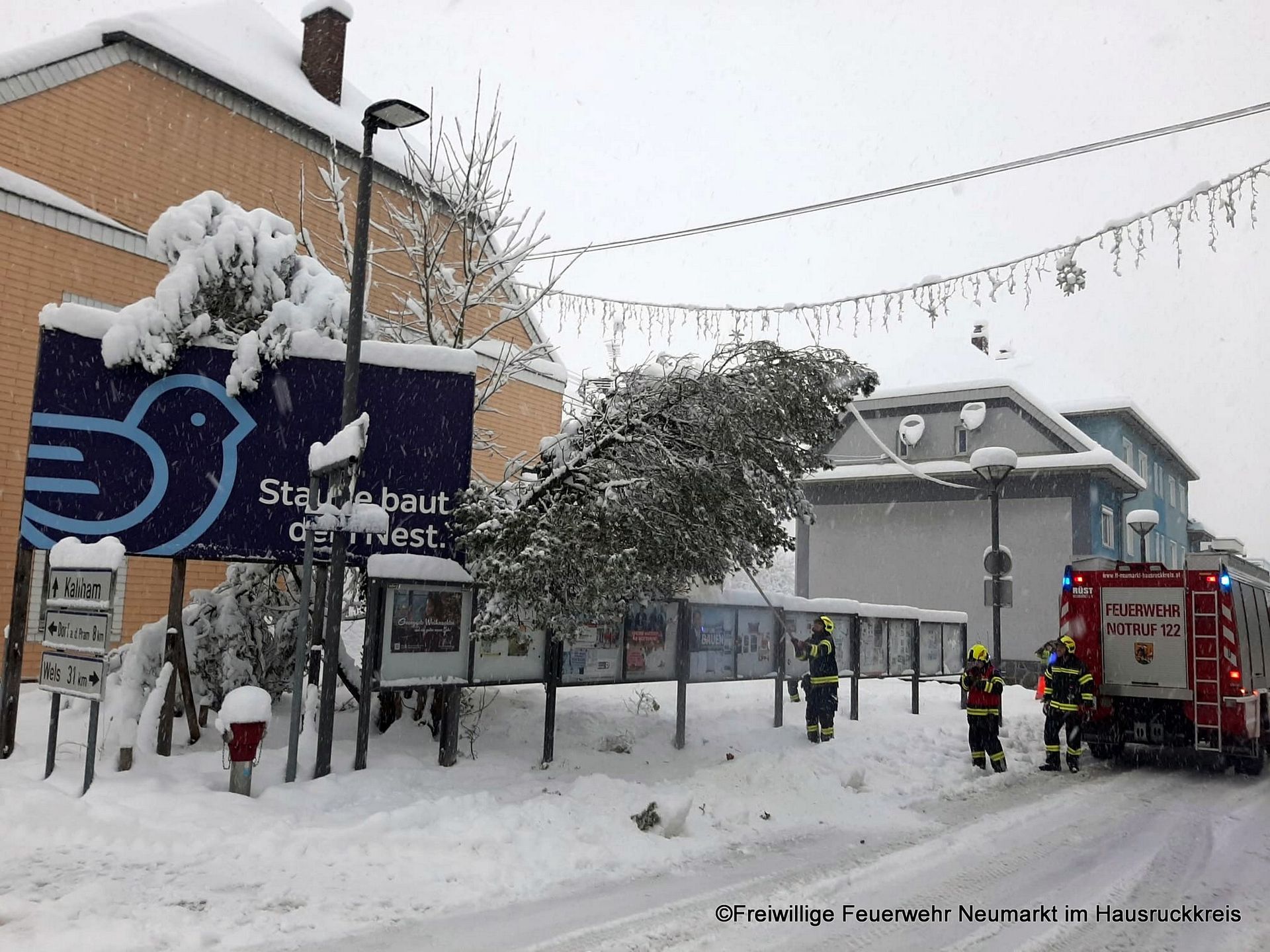 Am 2. Dezember um 07:46 Uhr wurde die Freiwillige Feuerwehr Neumarkt im Hausruckkreis aufgrund der stetig anhaltenden Schneefälle zu einem technischen Einsatz klein "Baum droht umzustürzen" am Marktplatz alarmiert.