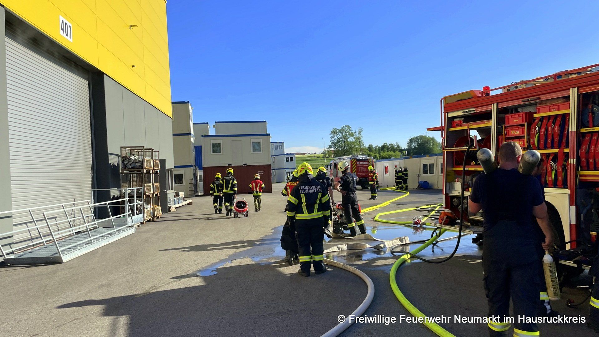 Angenommen wurde ein Industriebrand in der südlichen Halle mit mehreren Vermissten Personen. Die Feuerwehr Neumarkt stellte zuerst die Wasserversorgung für den Abschnitt Lacklager mittels Tragkraftspritze sicher.