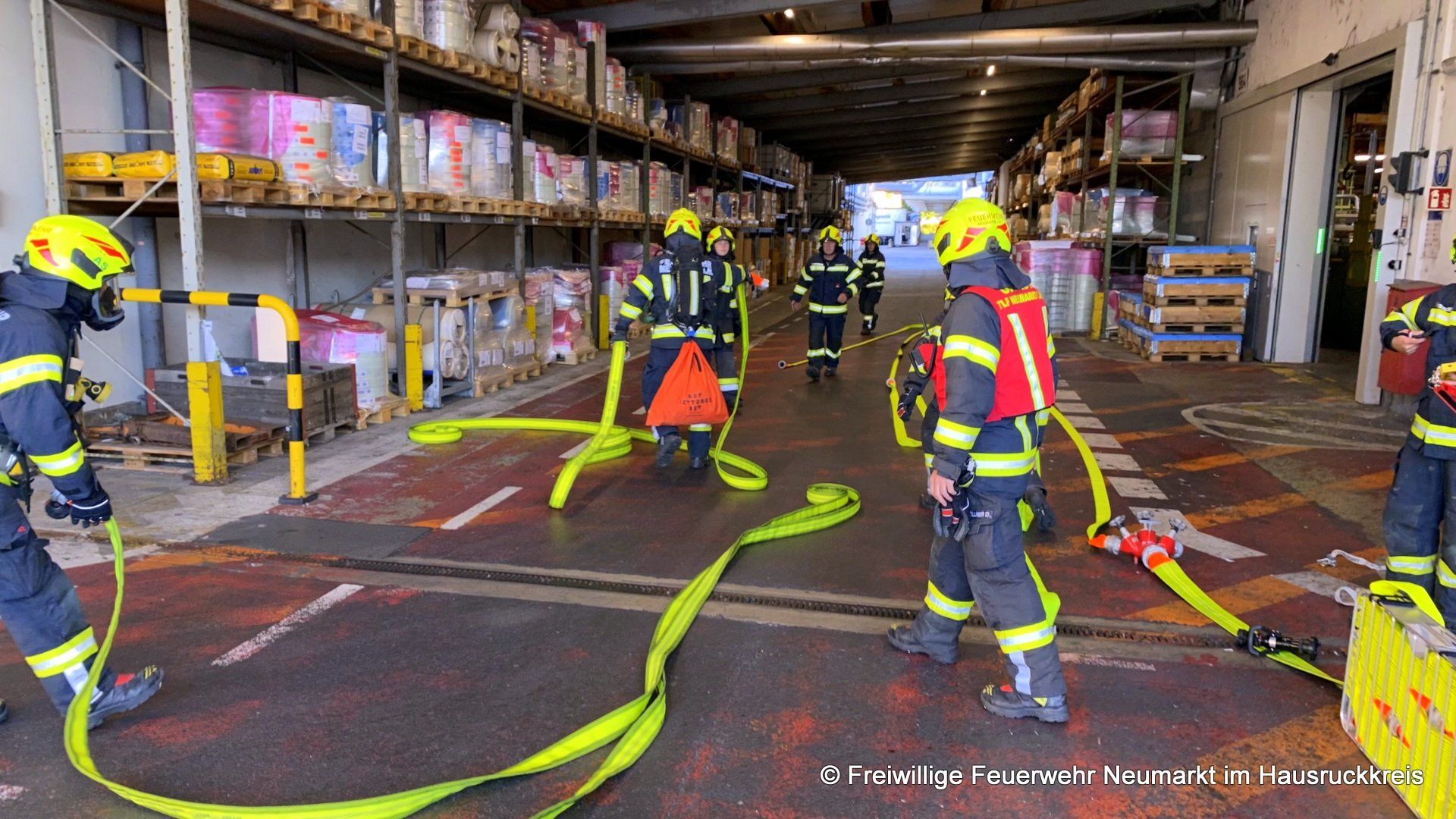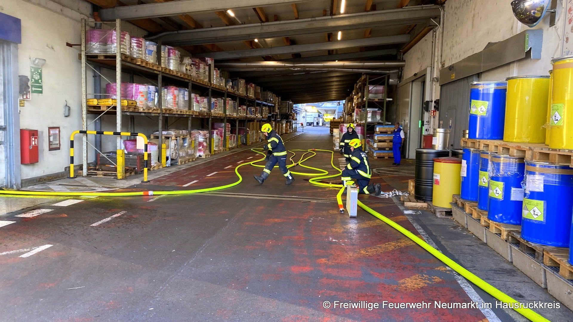 Es wurde ein Innenangriff unter Atemschutz durchgeführt und eine vermisste Person aus der verrauchten Halle gerettet. Zeitgleich wurden mehrere Außenangriffe durchgeführt sowie das Gefahrstofflager mit Schaum geflutet.