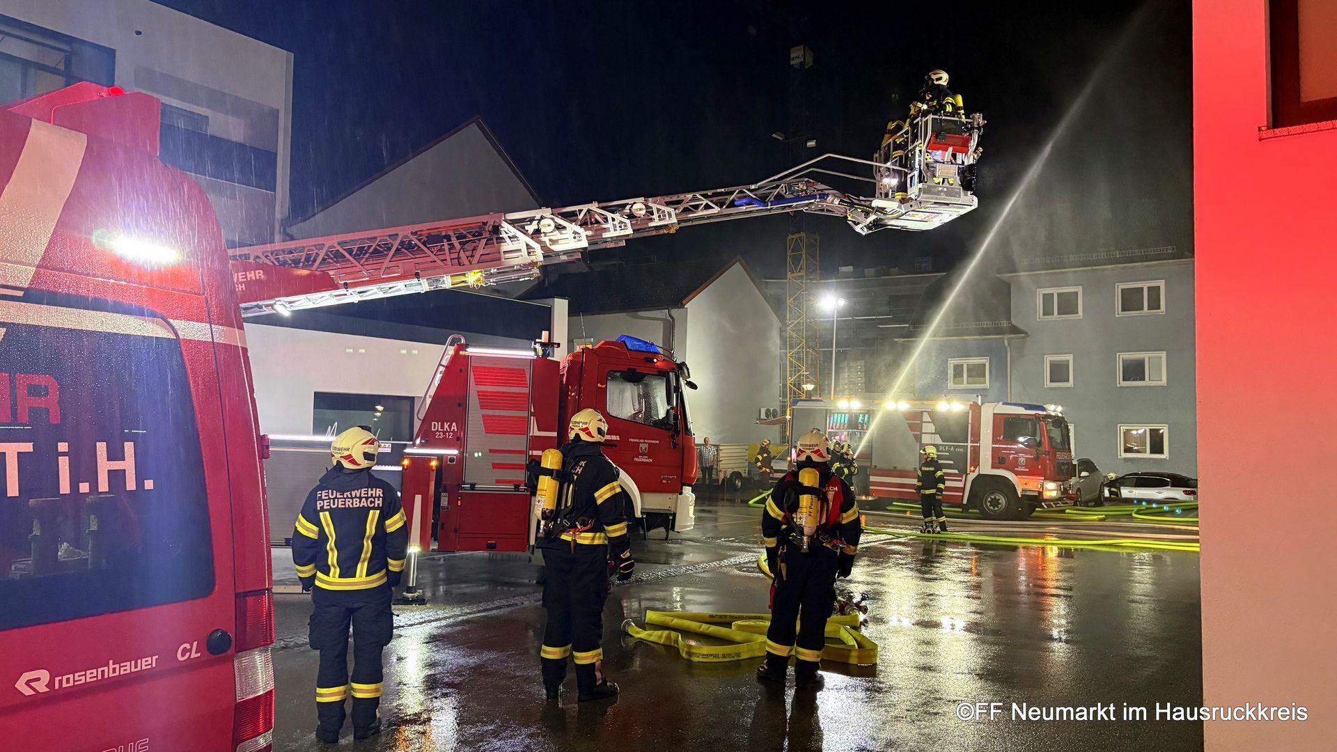 Am ersten Montag im Oktober führte die Freiwillige Feuerwehr Neumarkt eine groß angelegte Einsatzübung in der Hausruckpassage durch. Übungsannahme war ein Brand in einer Wohnung im dritten Obergeschoss, bei dem drei Personen als vermisst galten. Eine Person konnte in der Brandwohnung von einem Atemschutztrupp lokalisiert und über die Drehleiter gerettet werden. Zwei weitere Personen lagen im stark verrauchten Stiegenhaus – sie wurden von Atemschutztrupps aufgefunden und über das Stiegenhaus ins Freie gebracht. Parallel dazu wurde der Rauchabzug im Stiegenhaus geöffnet, das Objekt druckbelüftet und die Löschwasserversorgung über zwei nahegelegene Hydranten sichergestellt. An der Übung beteiligten sich die Feuerwehren Neumarkt, Kallham und Peuerbach. Die realitätsnahe Einsatzübung bot den teilnehmenden Kräften wertvolle Erfahrungen bei der Bewältigung eines komplexen Brandeinsatzes in einem mehrstöckigen Wohngebäude. Die Feuerwehr Neumarkt bedankt sich herzlich bei den beteiligten Feuerwehren für die hervorragende Zusammenarbeit. Ein besonderer Dank gilt dem Eigentümer des Objekts für die Bereitstellung des Übungsgebäudes sowie für die anschließende Verpflegung der Einsatzkräfte.