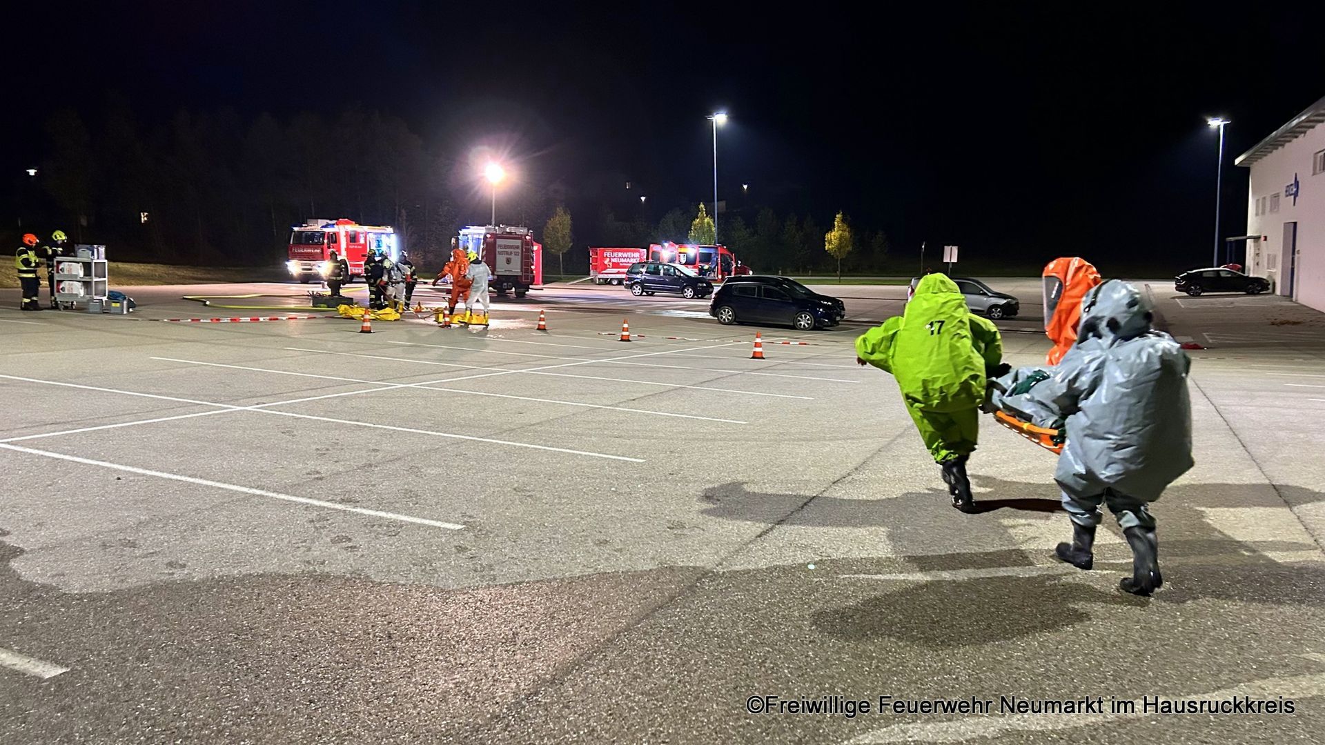 wurde die Dekontamination der Einsatzkräfte durchgeführt. Währenddessen kam es zu einem Übungs-Notfall und ein Vollschutzträger wurde mit der Schleifkorbtrage aus dem Gefahrenbereich gerettet und der Deko übergeben.